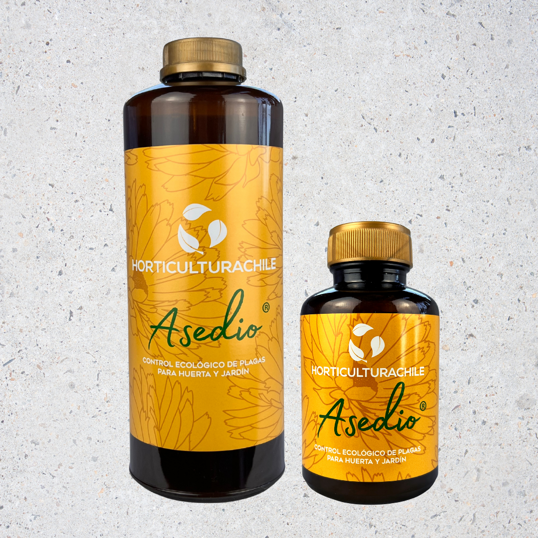 Asedio® es un excelente controlador ecológico de plagas concentrado, fungicida foliar, repelente natural de insectos plaga, limpiador de plantas, estimulante del crecimiento y regenerador del tejido vegetal, formulado con Jabón Potásico Horticulturachile y Aceite de Neem 100% puro prensado en frío libre de solventes y aditivos sintéticos.
