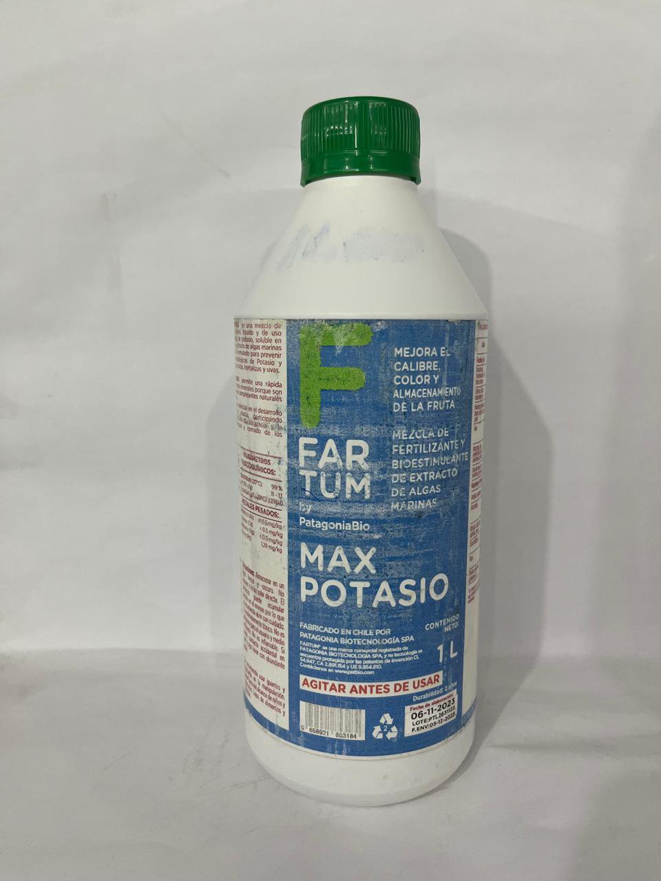 FERTUM® POTASIO es una mezcla de fertilizante y bioestimulante líquido y de uso foliar, en base a Potasio complejado, soluble en agua con extracto de algas marinas nativas del sur de Chile. Formulado para prevenir y corregir carencias fisiológicas de Potasio y mejorar la calidad de las frutas, hortalizas y uvas.